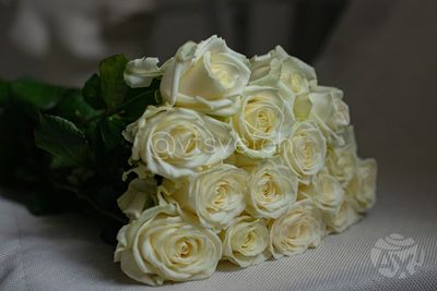 Необычайно нежная белая роза «Аваланш» с бледно-зеленым цветом лепестков у основания подчеркивает торжественность момента и нежность чувств.