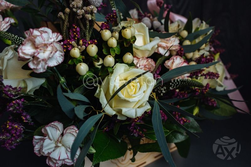 Основной состав: Роза, альстромерия, гвоздика, вероника, гиперикум.